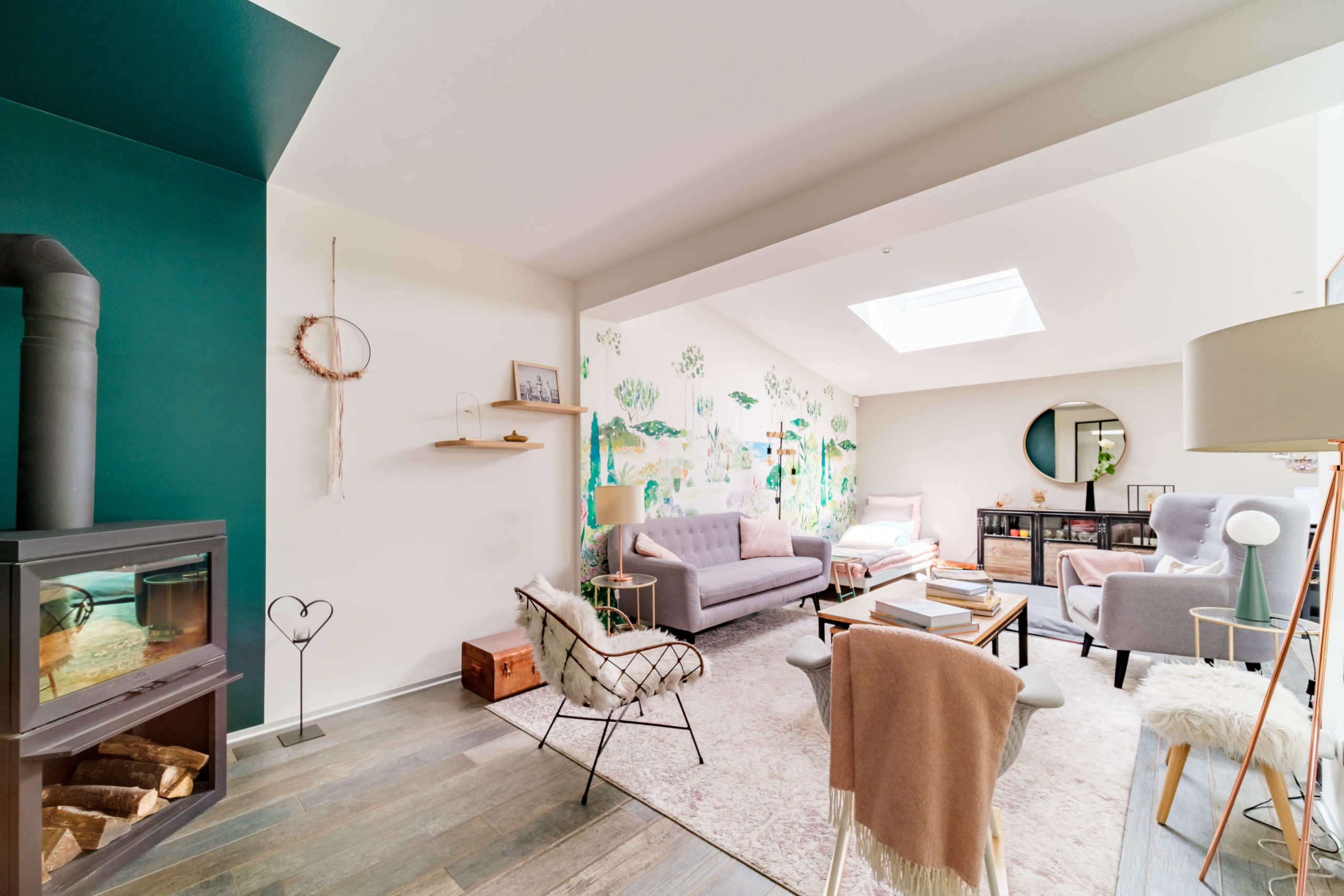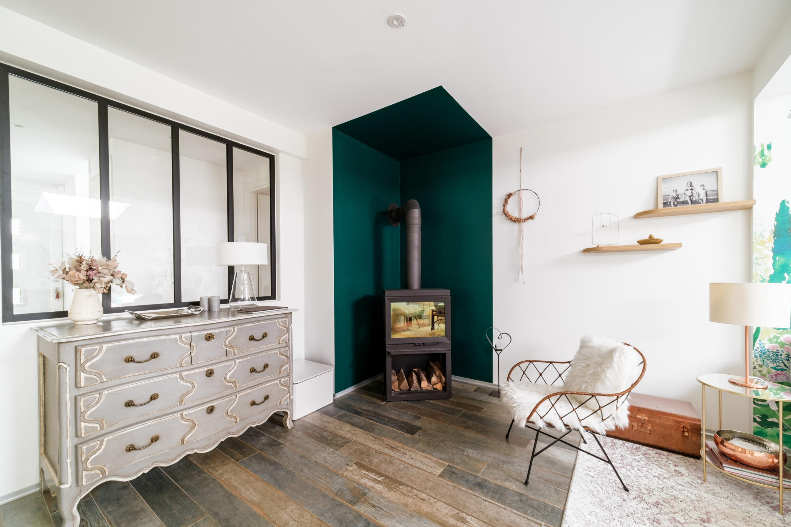 - L’espace salon a été crée vers le poêle à bois qui a été raccordé à un ancien conduit de cheminée. De nombreuses assises (canapé, fauteuils…) ont été installées ainsi que des tables basses gigognes, pour un effet de convivialité. Une banquette a été installée pour un coin lecture dédié aux enfants, avec à proximité de jolies malles pour ranger leurs livres. Nous avons joué sur les textures différentes selon les assises, afin de créer cet ambiance chaleureuse.
