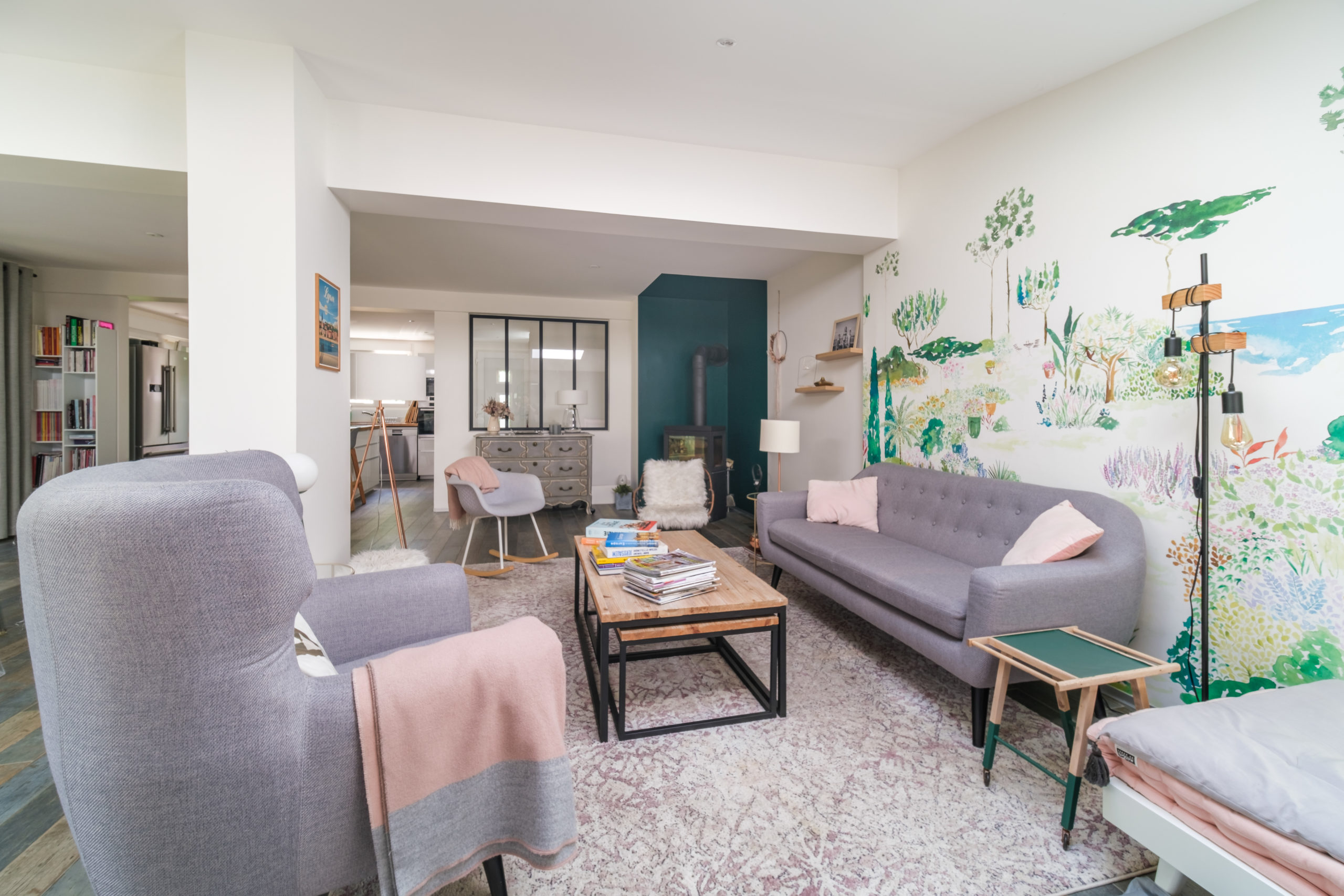 • L’espace salon a été crée vers le poêle à bois qui a été raccordé à un ancien conduit de cheminée. De nombreuses assises (canapé, fauteuils…) ont été installées ainsi que des tables basses gigognes, pour un effet de convivialité. Une banquette a été installée pour un coin lecture dédié aux enfants, avec à proximité de jolies malles pour ranger leurs livres. Nous avons joué sur les textures différentes selon les assises, afin de créer cet ambiance chaleureuse.