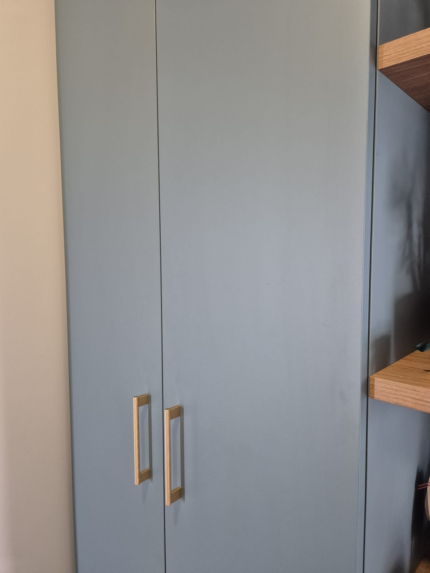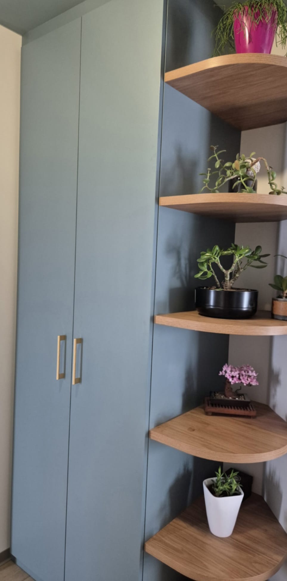 une grande penderie sur-mesure, avec étagères intérieures et finitions arrondies en bout d’élément, pour une circulation fluide et un rendu visuel tout en douceur.
