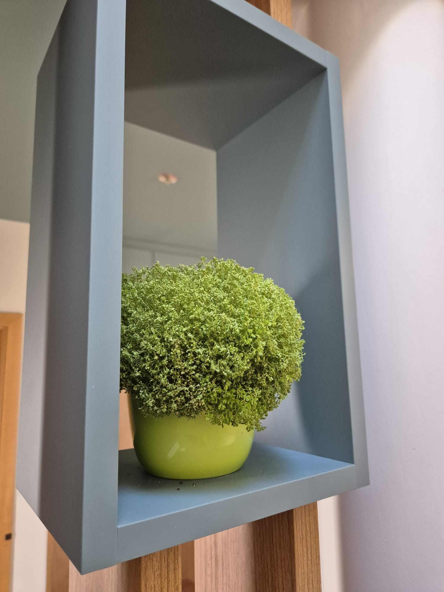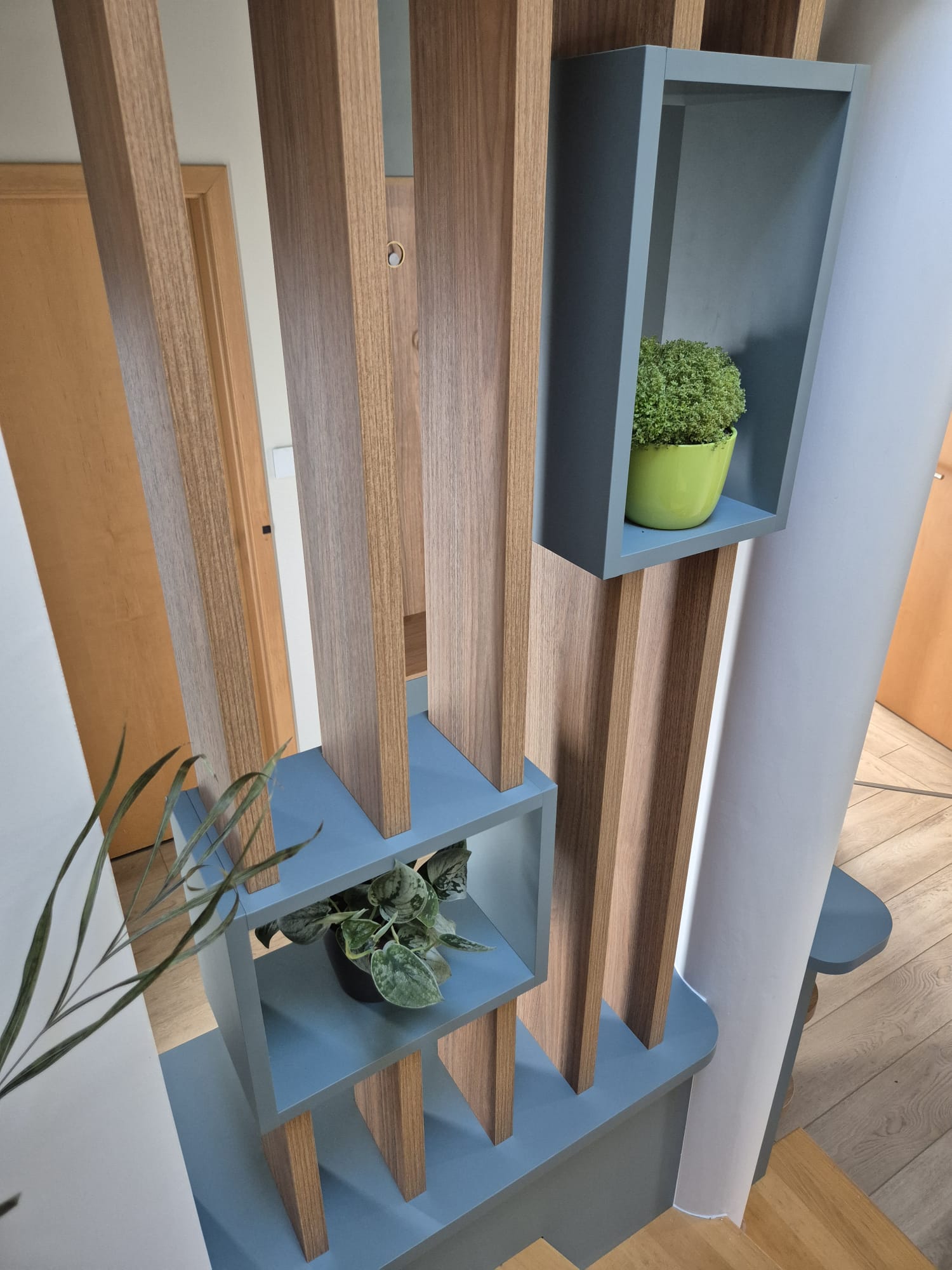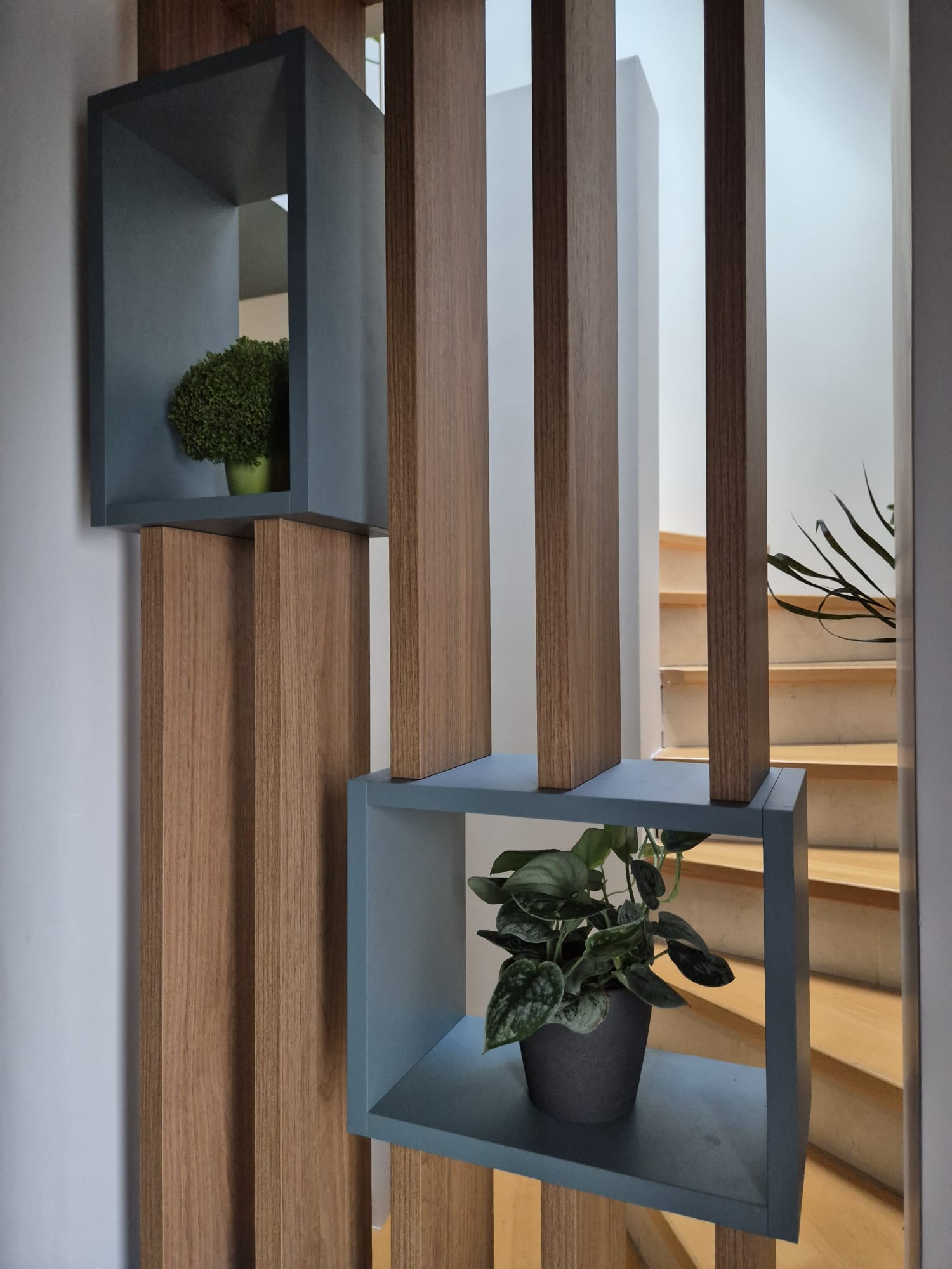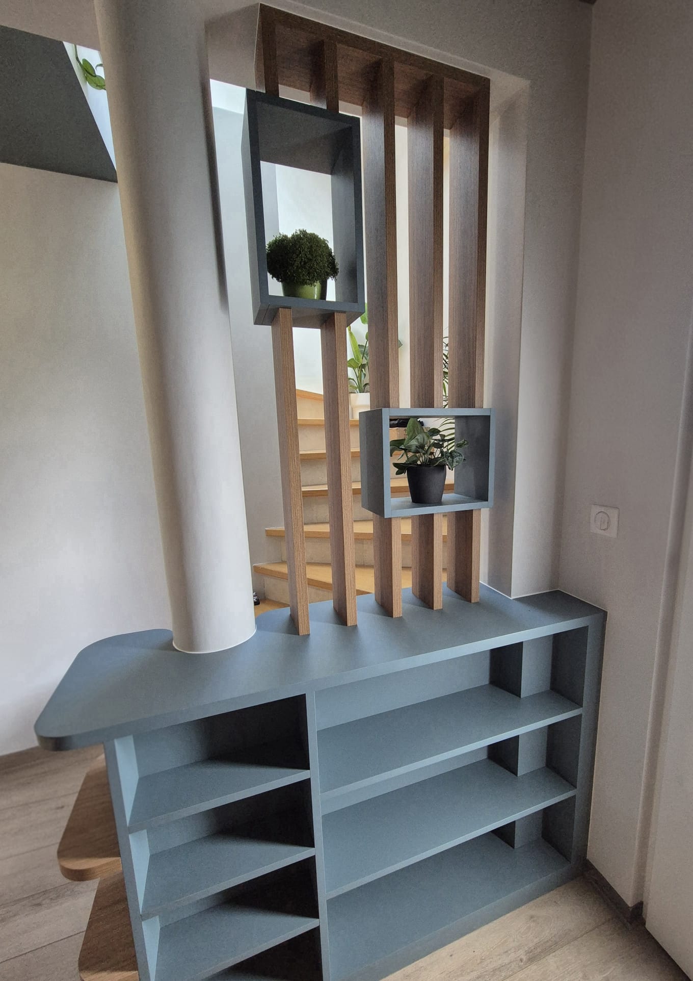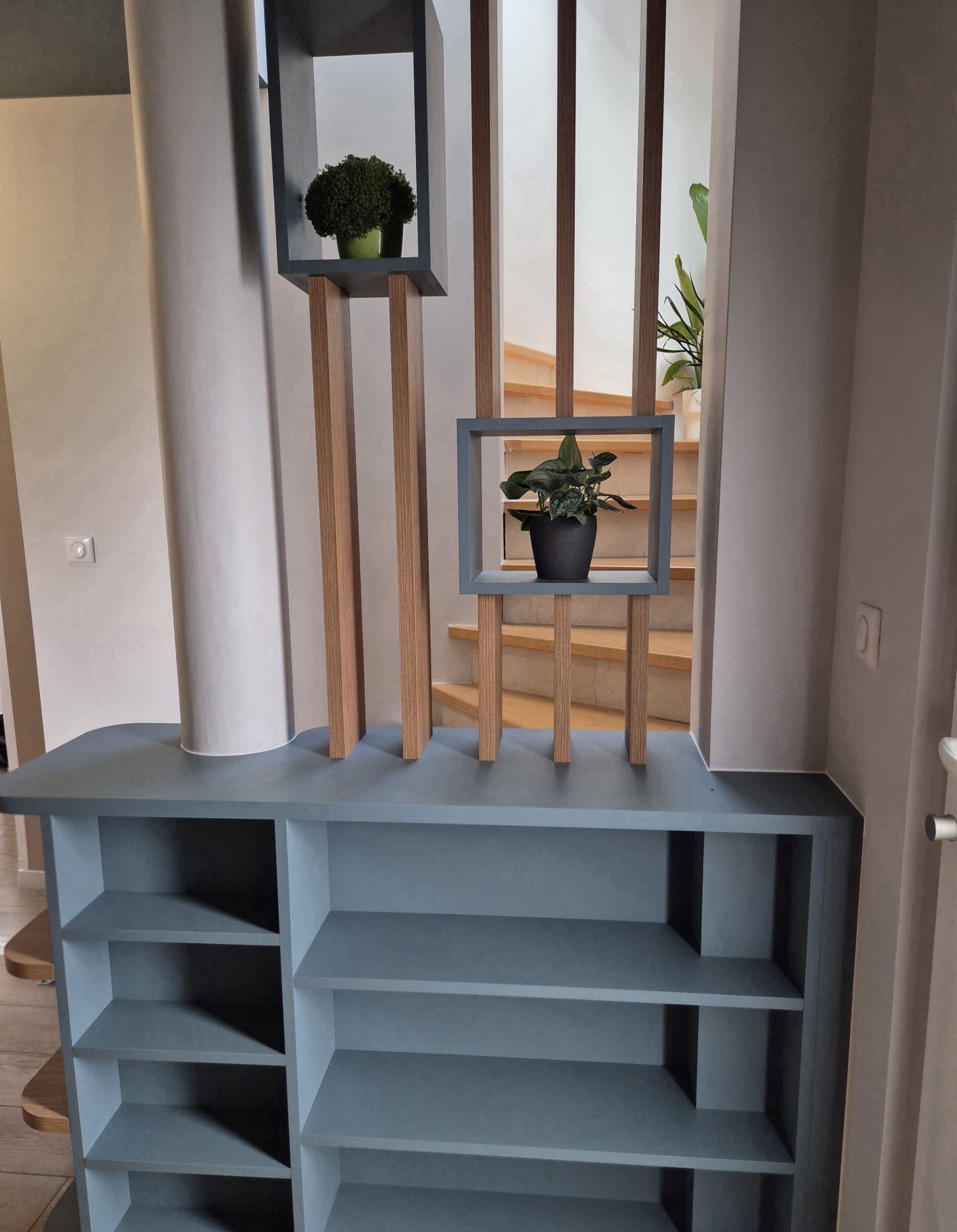 Il structure visuellement l’espace et filtre la vue sur l’escalier menant à l’étage.