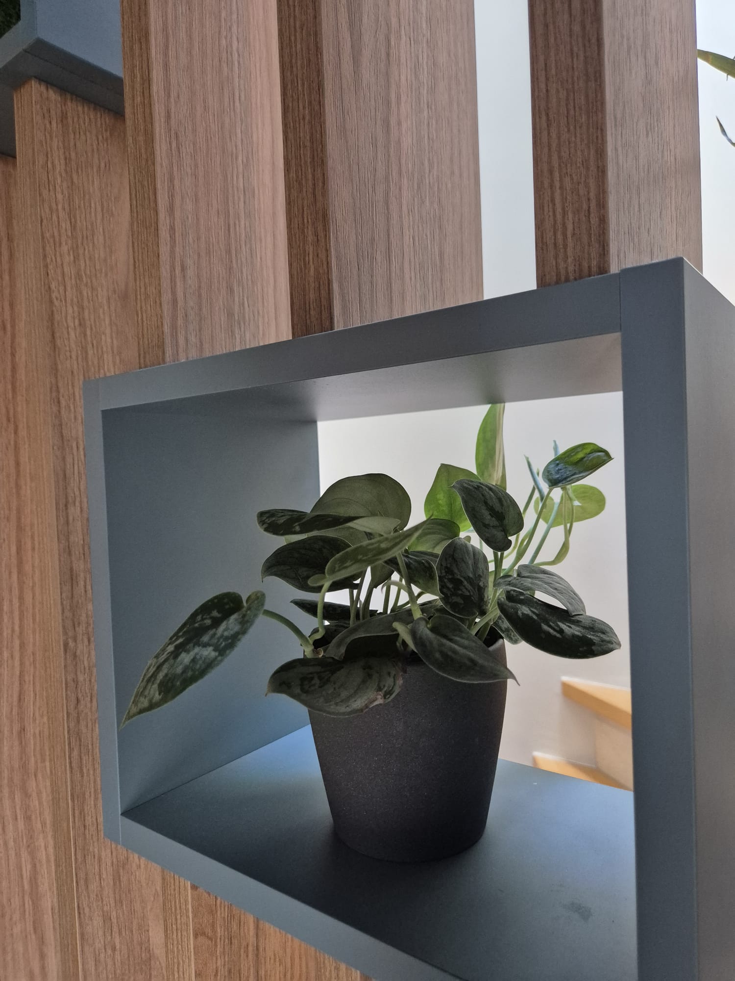Le bois du claustra apporte une touche naturelle et chaleureuse, parfaitement équilibrée.