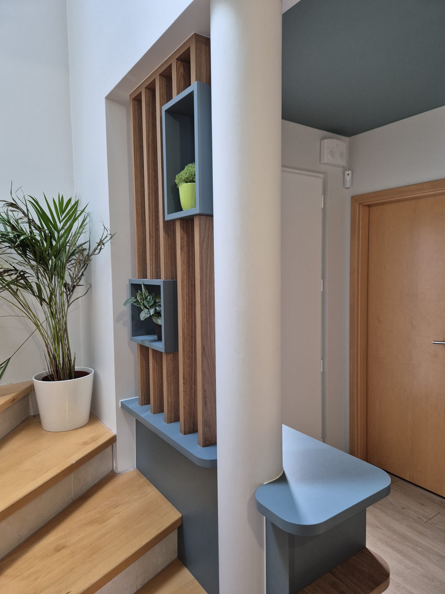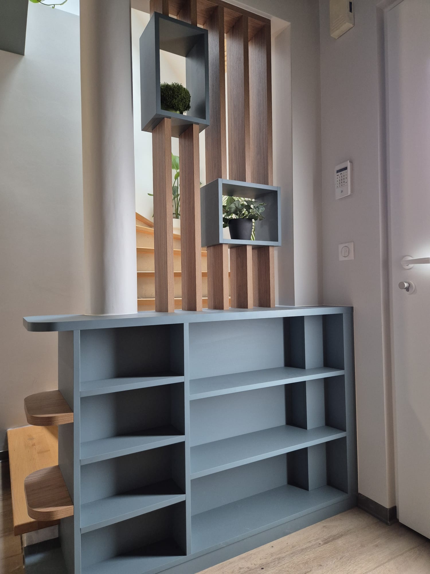 Pour redonner du sens et de l’équilibre à cette entrée, j’ai conçu un claustrat sur-mesure en bois, placé dès l’arrivée.